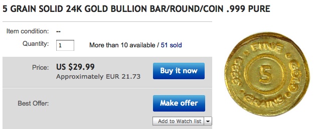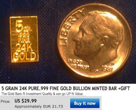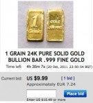 Pozorně si prohlédněte vystavené aukce, no nebyla by to radost, koupit si zlato v miniaturních cihličkách i pětkrát levněi než v ČR? Zlaté destičky 1gr ale namají 1gram!!! Pozor USA a Anglie používají 1grain. Dokonce i zajímavá zlatá mince 5gr vypadá výhodně, ale stále je to méně než 1/2 gramu! Čtěte pozorně co se kde píše, že je to výhodné je tučně, kup teď, je nepřehlédnutelné, ale pak si také přečtěte, že to nemůžete vrátit. Ale kdo by to vracel? Kdo by vracel koupené výhodné zlaté destičky. Proč vracet zlaté destičky ze zlata 24kt když jsou tak levné? Vrátit je zpět by rád ten ten se přepočítal, že není grain jako gram. Kdo neví co je grain a co je gram. Jaký je rozdíl mezi grainem a gramem pak přijde na pěkné peníze, pokud místo jednoho koupíte třebas 1000 kusů.