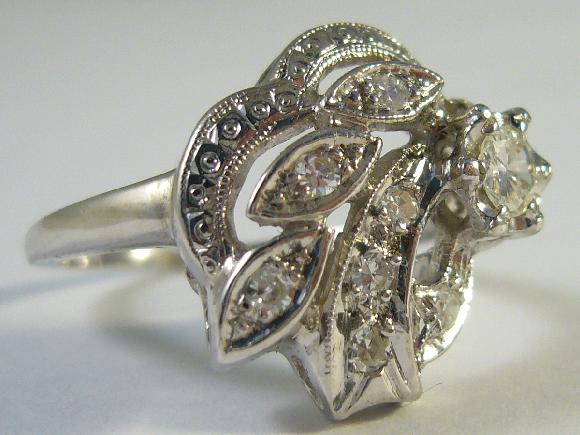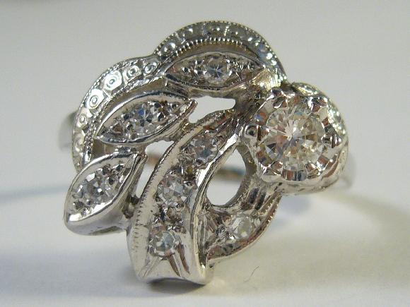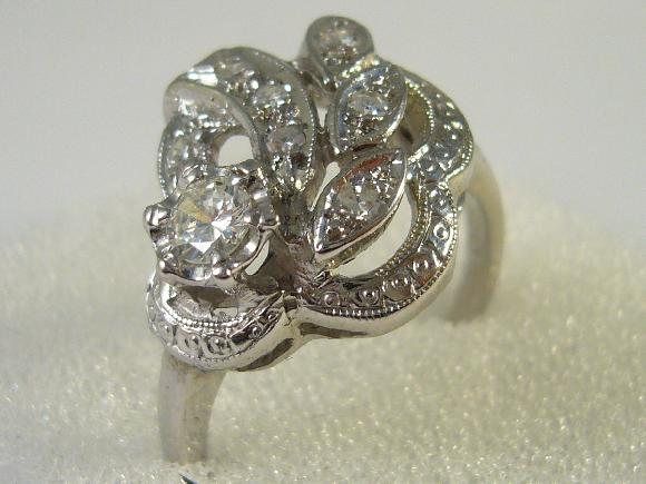 Starší prsten s přírodními diamanty, briliantového brusu, z bílého zlata, nově přepuncovaný.