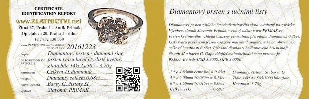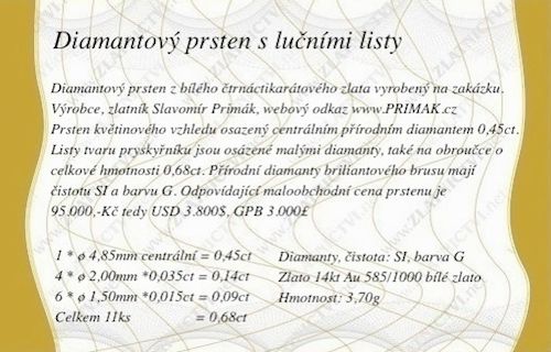 Prsten květinového vzhlůedu osazneý centrálním přírodním diamantem 0,45ct. Listy ve tvaru pryskyřníku jsou osázené malými diamaty, také na obroučce o celkové hmotnosti 0,68ct. Přírodní diamanty briliantového brusu mají čistotu SI a barvu G. Odpovídající maloobchodní cena prstenu je 95.000,-Kč, tedy USD 3.800$, GPB 3.000£.