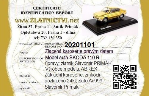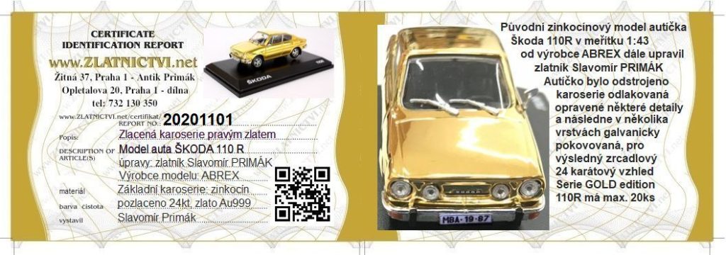 Certifikát na pozlacenou karoserii modelu autíčka.