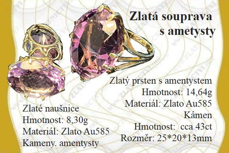 Certifikát k zlaté soupravě s ametysty. Vyobrazení certifikátu, opis textu a přidaný popis pro ověřitelnost.