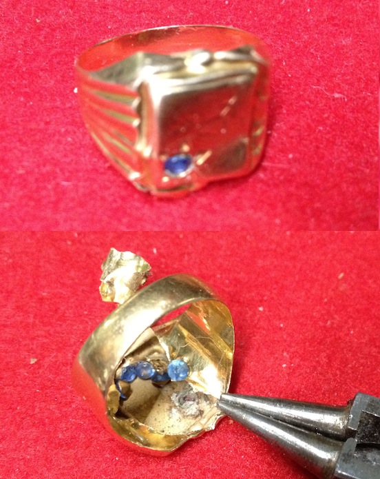 Tento prstýnek vypadal zajímavě. barva a cizí punc 18kt jako arabský šperk. Na výkup zlata ne tak vzácný, lehký zlomek, vyloupnout kamínek a ejhle pod slupkou zlata se ještě další kamínek skrývá, no a nakonec jich tam bylo více. To překvapení není milé. Při výkupu zlata zlomkového je nutno vše vyčistit, nekupovat špínu, kamínky ani jiné překvapení za cenu zlata. Podívejte na fotografii co se tam schovávalo.