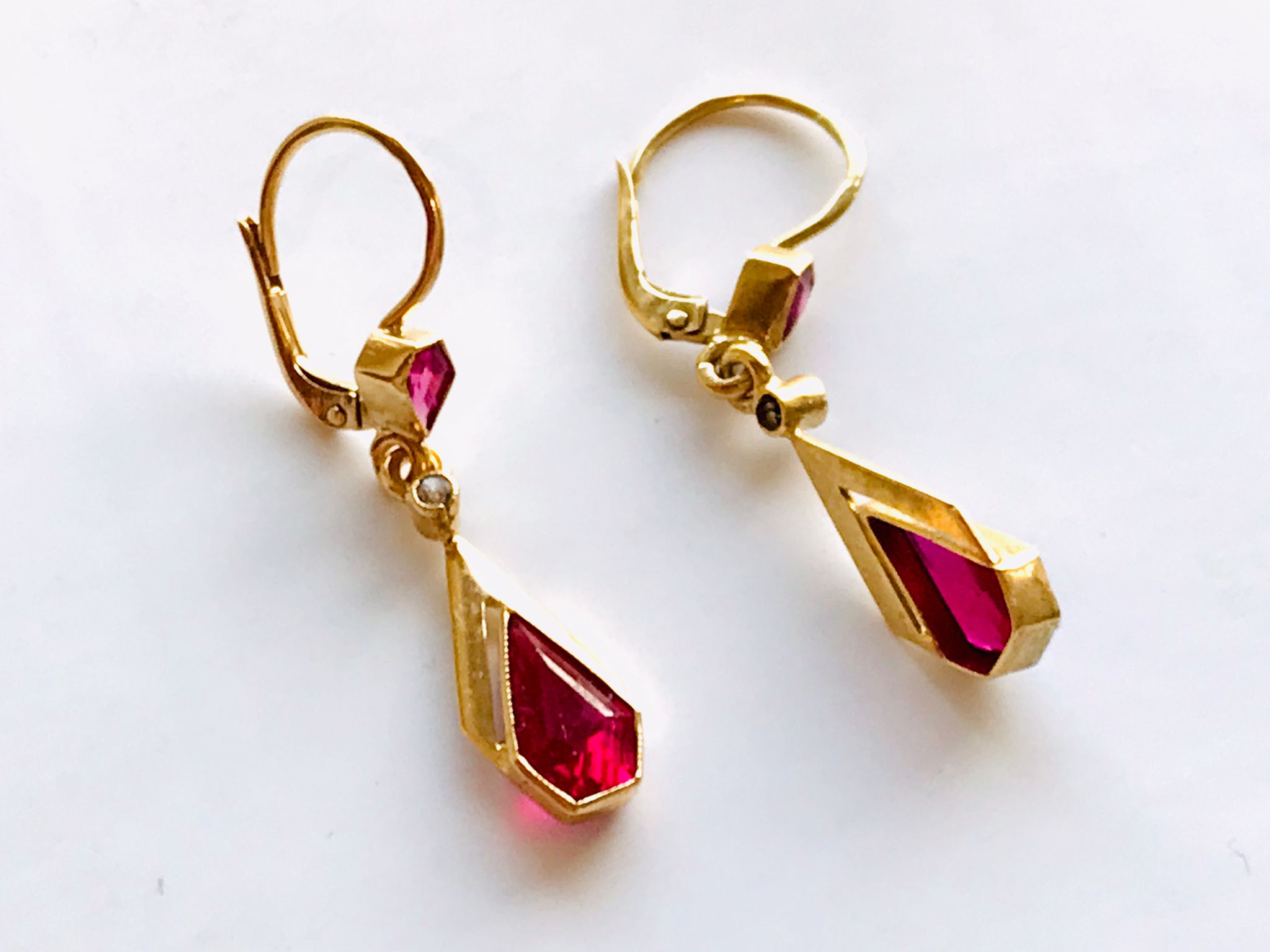 Oprava šperků, zlaté naušnice ArtDeco, zlato 14kt s červenými kameny, se starou opravou cínem.