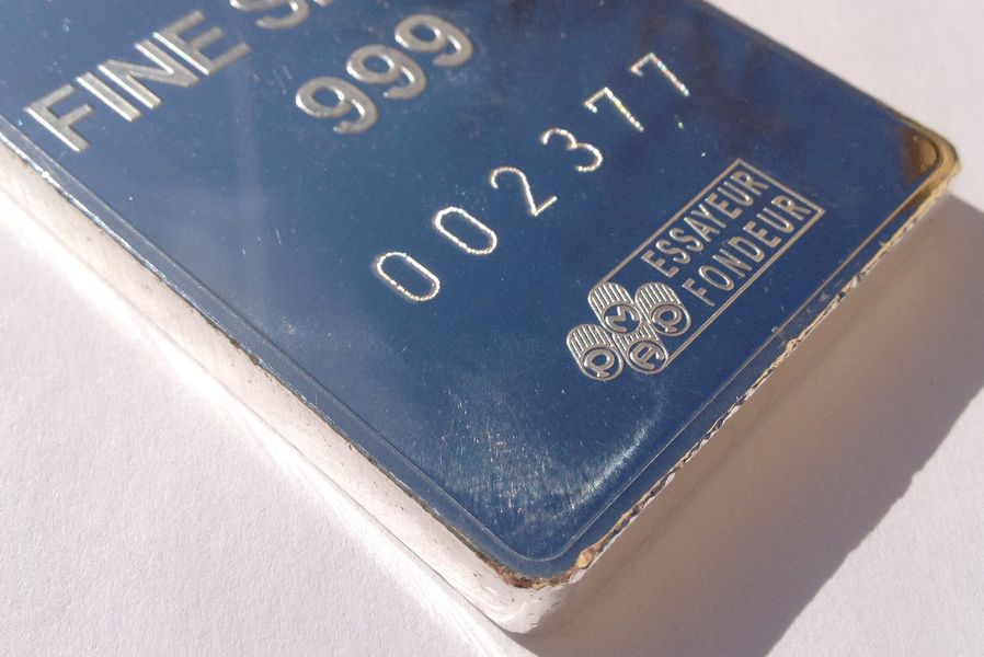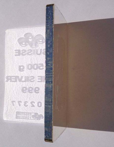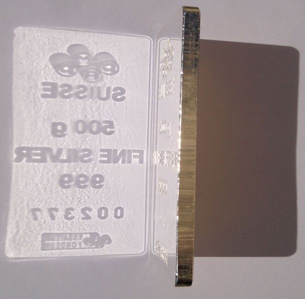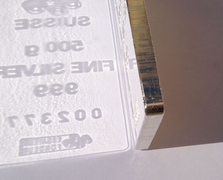 Všiměte si také hrany této investiční cihly, kdy je jasně patrné rýhování od strižení z plechu. To je markantní rozdíl mezi litými a raženými slitky. Ražené investiční cihly jsou nákladnější a oblíbenější, ale také dražší již ve výrobě, ač obsah stříbra v investičním slitku raženém a litém je stejný, pak náklady na výrobu jsou však pro investiční ražený slitek vyšší.