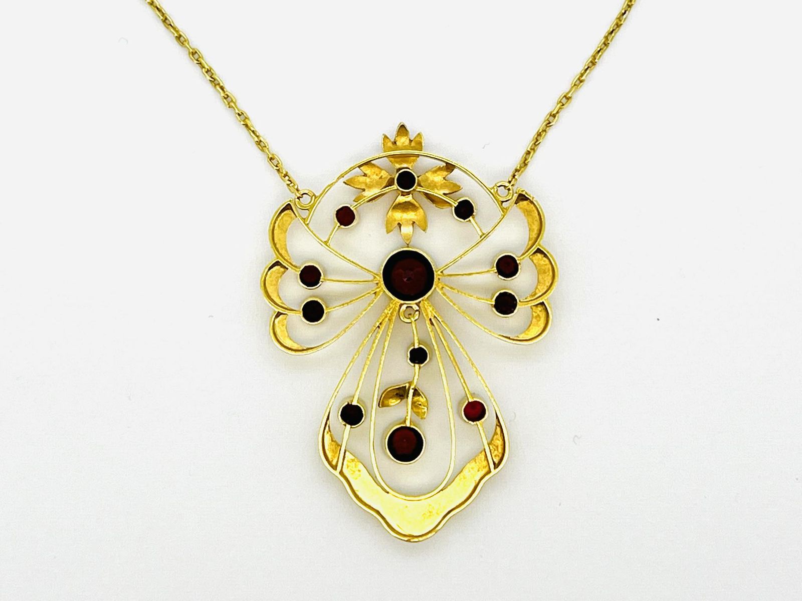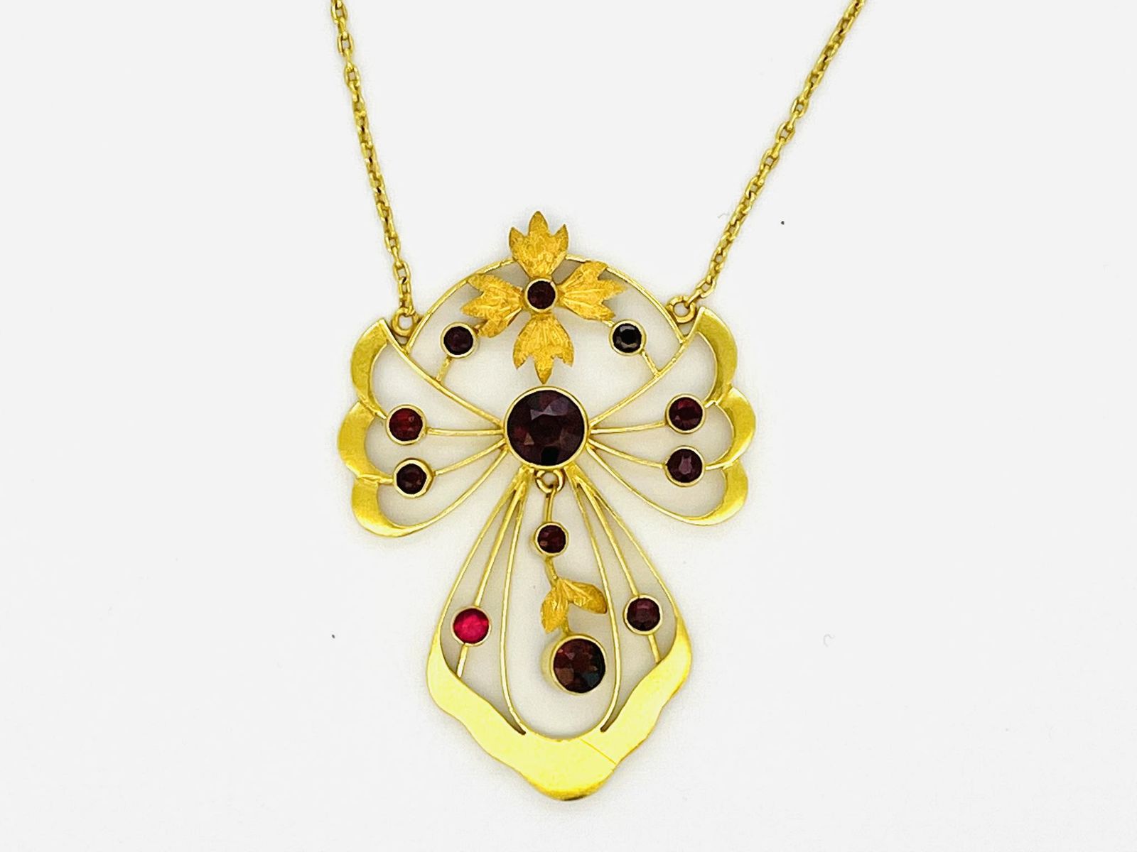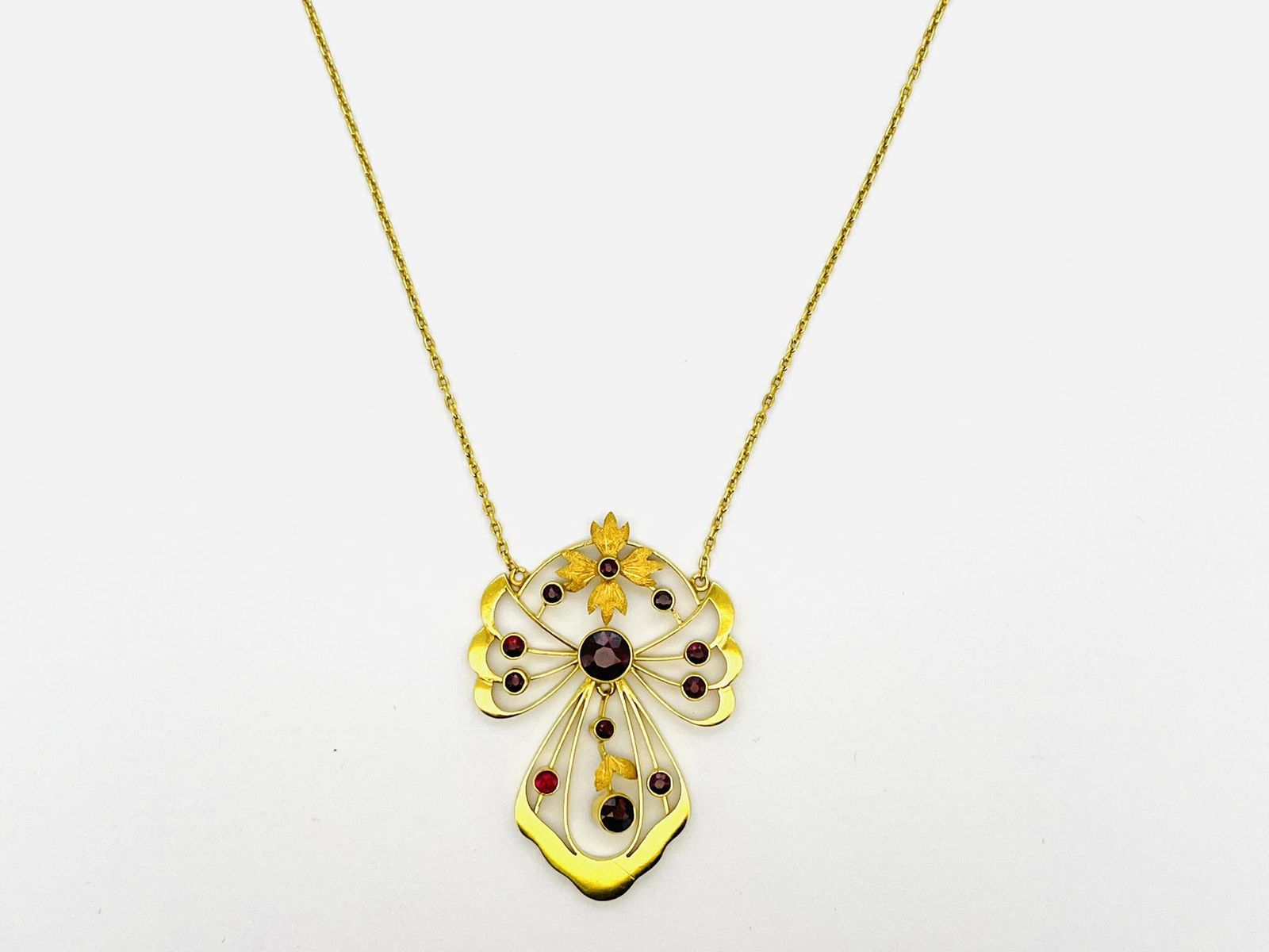 Secesní náhrdelník osázený českými granáty ve žlutém zlatě.