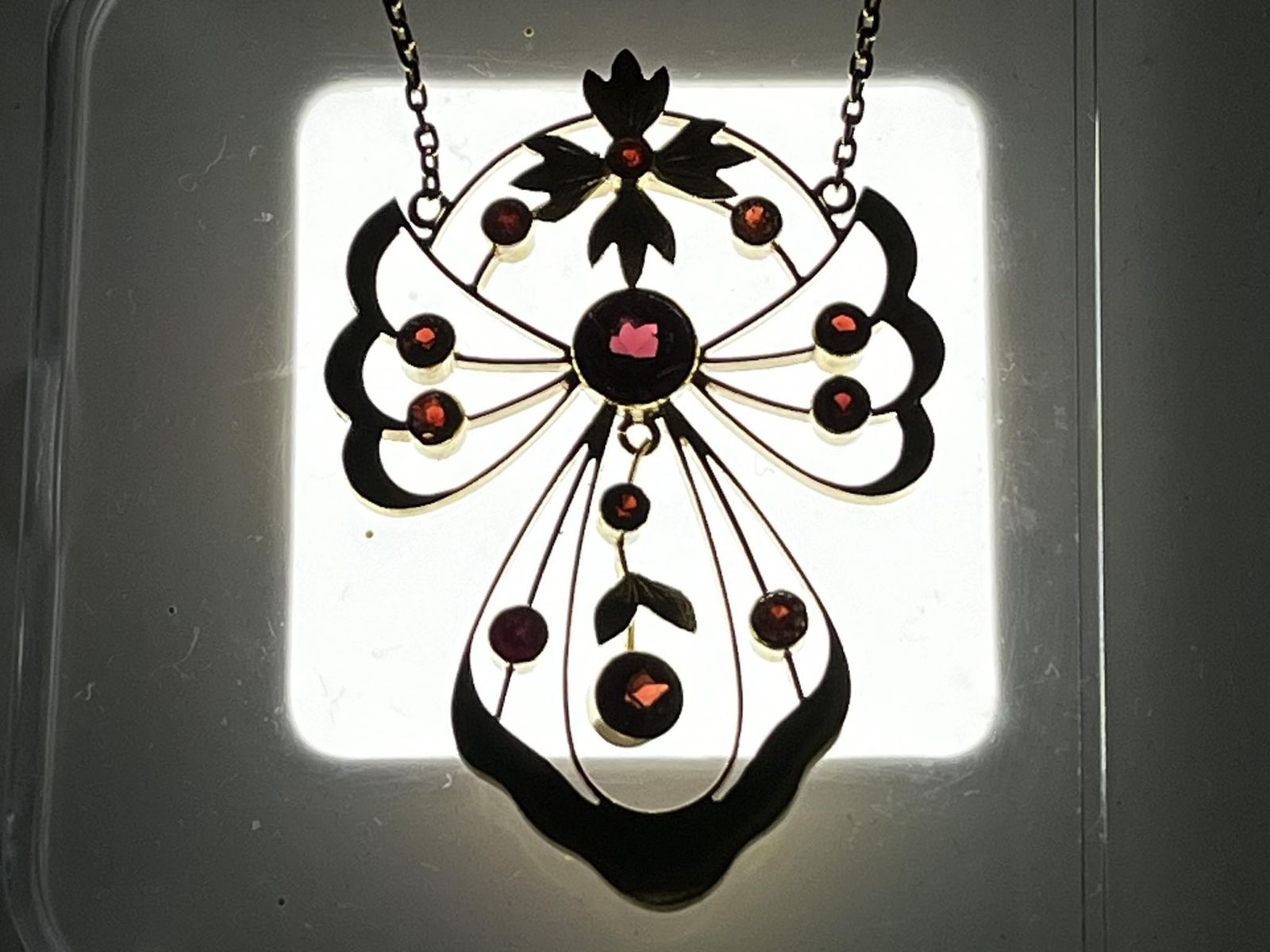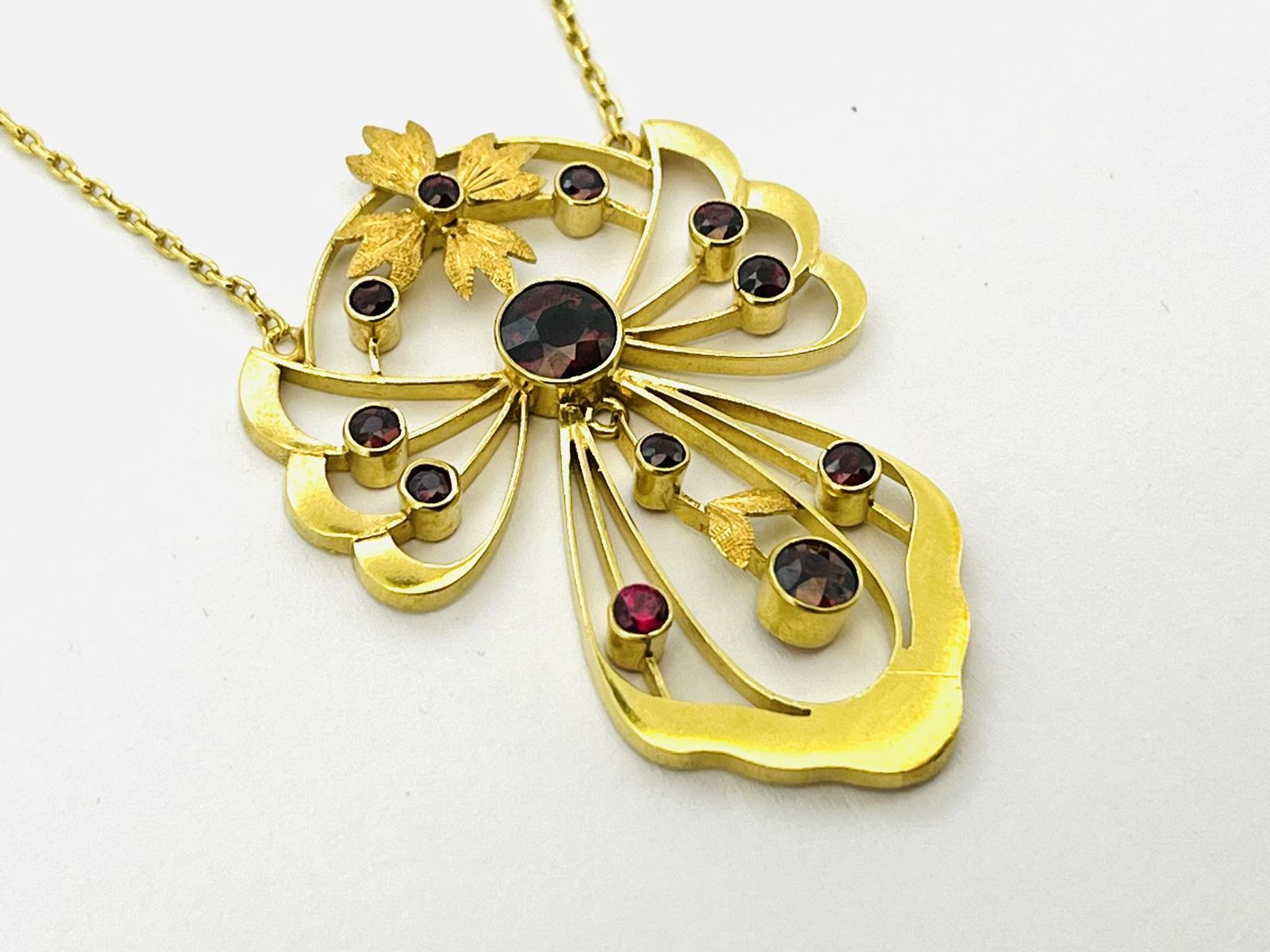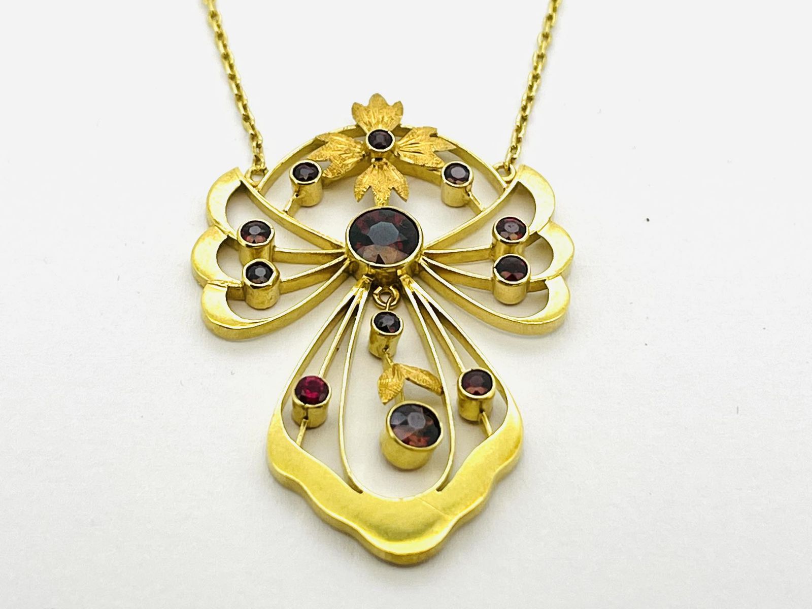 Secesní náhrdelník osázený českými granáty ve žlutém zlatě.