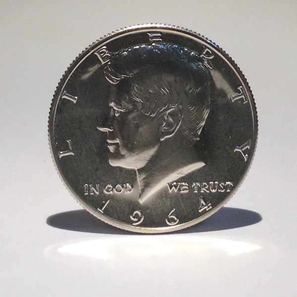 Pamětní stříbrná pamětní mince JFK, vydaná následující rok po jeho smrti. Původní, autntický půldolar z roku 1964 je ze stříbra o vyšší ryzosti (jakosti) než z následujících let.