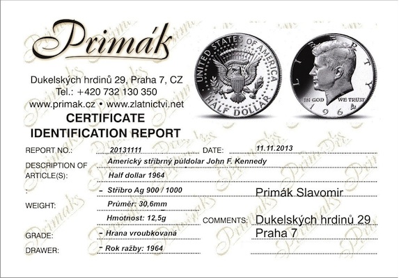 Při koupi samostatne mince Americké dolary, Americký dolar, Americký půldolar, Půl dolar Kennedy (Kenedy) Half dollar, dolar Amerika, Dolar USA, získáváte certifikát pravosti, autentičnosti s vyobrazením mince popisem k lehkému ověření.